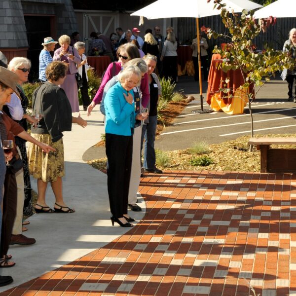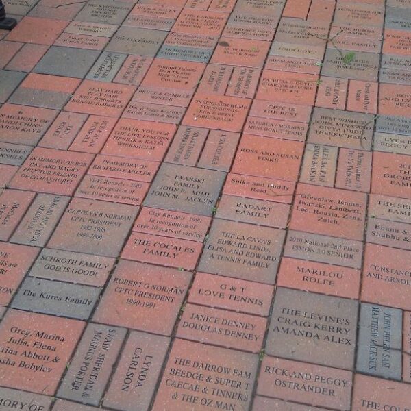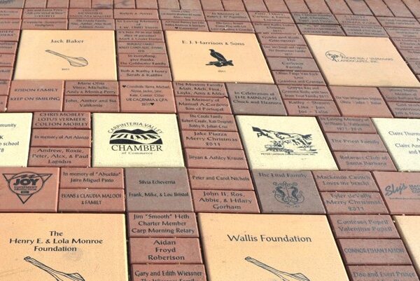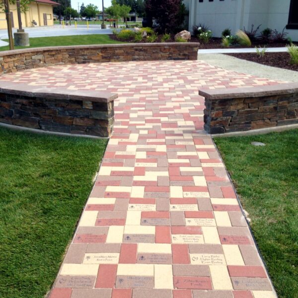 This picture shows a great way to utilize multiple levels of donor recognition with different size laser engraved bricks. Shown here are 4×8, 8×8 12×12 and 16×16 engraved pavers installed…